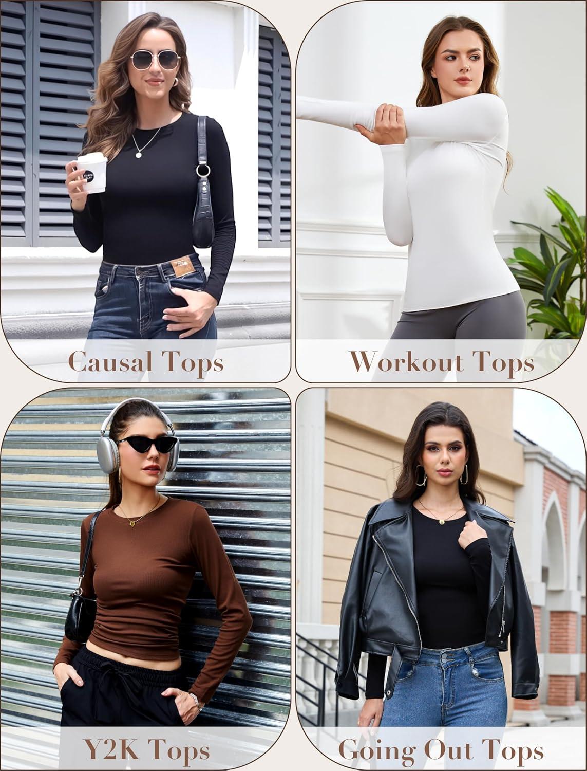 CE’ CERDR 3/5 Pack Womens Long Sleeve Shirts Crew Neck Basic Tees Tight Fitted Casual Going Out Stretchy Slim Tops(3 Pack Black White Dark Grey)