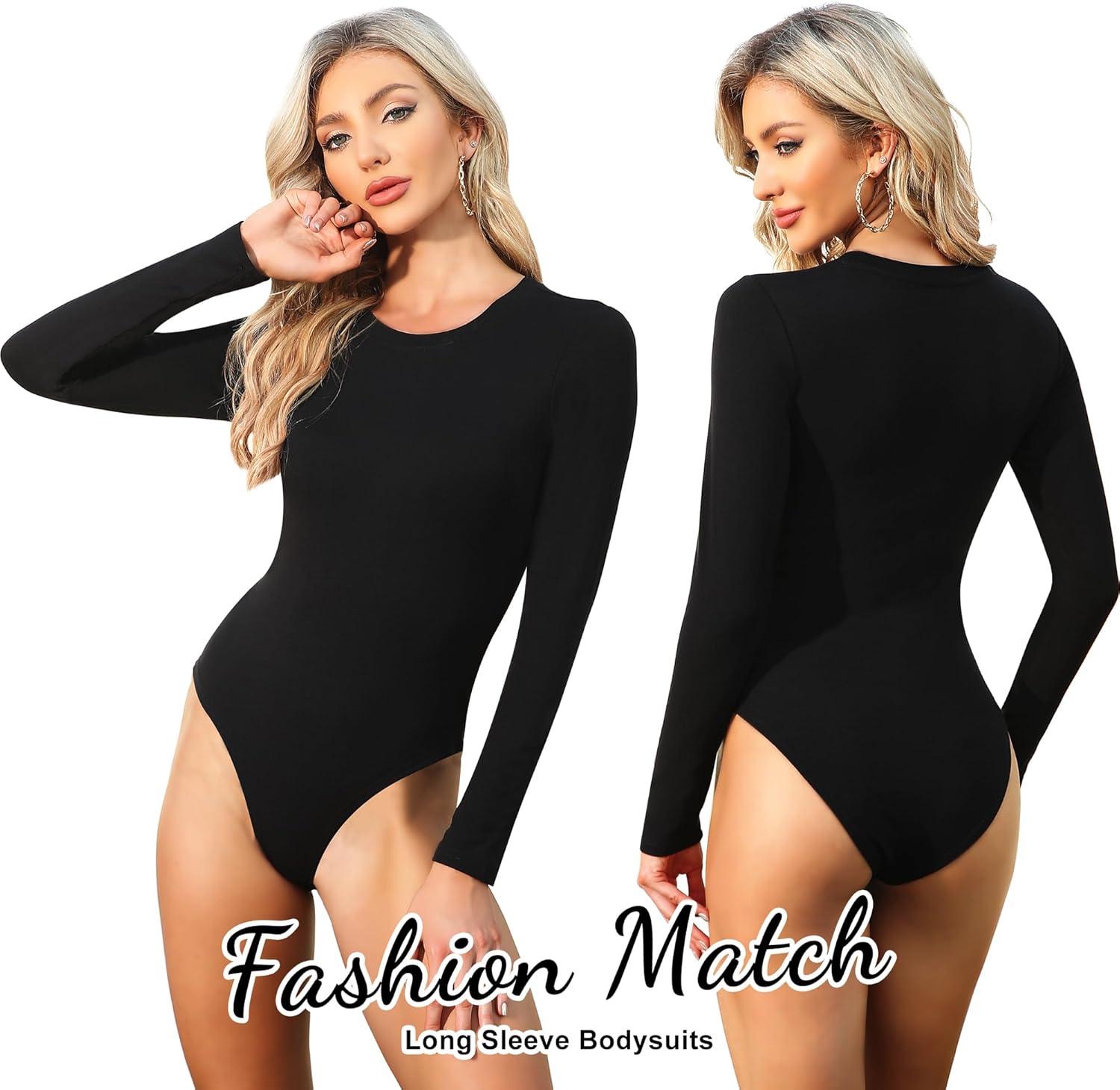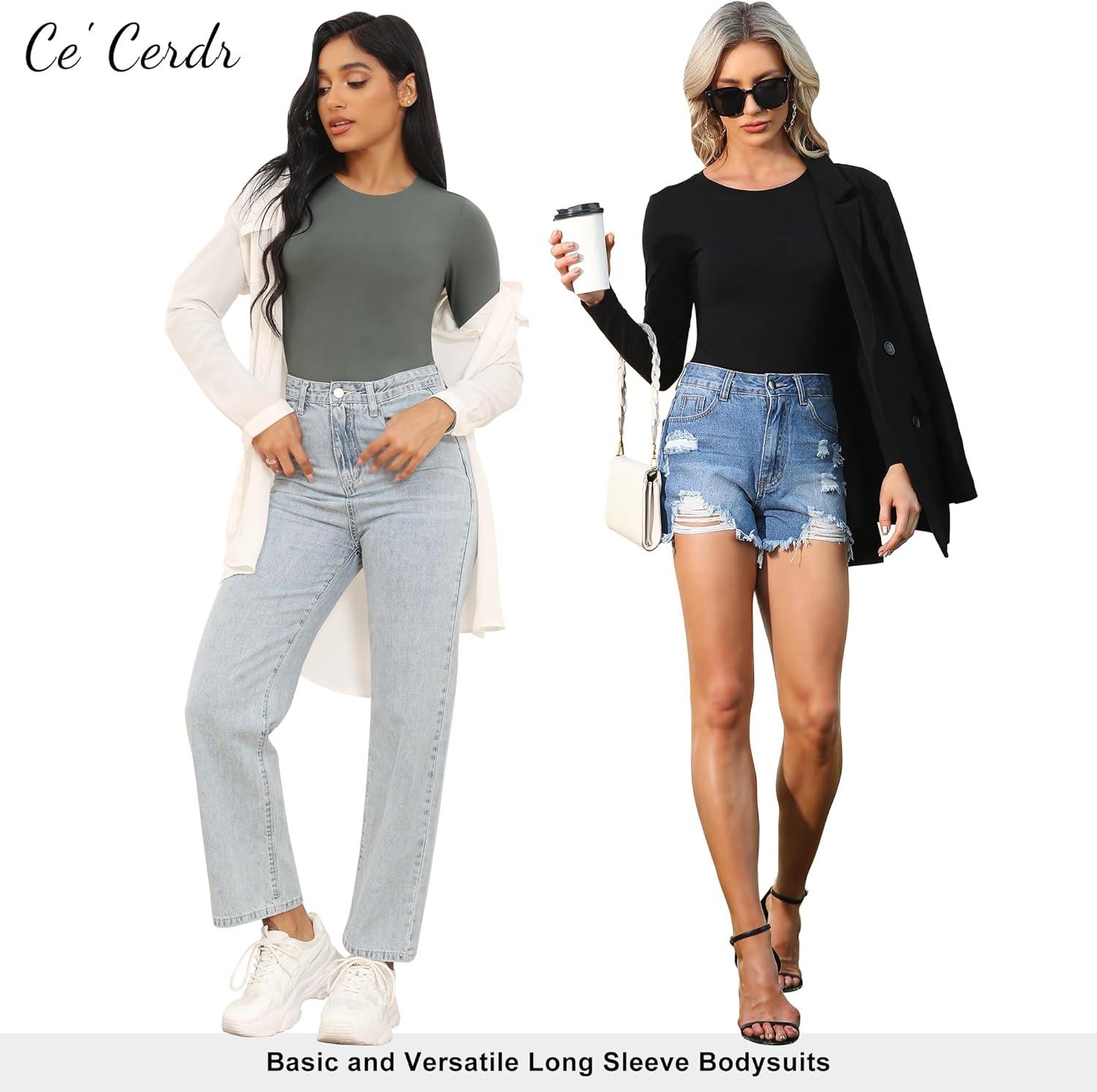CE’ CERDR 4/5 Pack Long Sleeve Bodysuit for Women Round Neck Casual Stretchy Basic Shirts Crew Neck Body Suits Tops(5 Pack:black white nude dark Blue olive Green)
