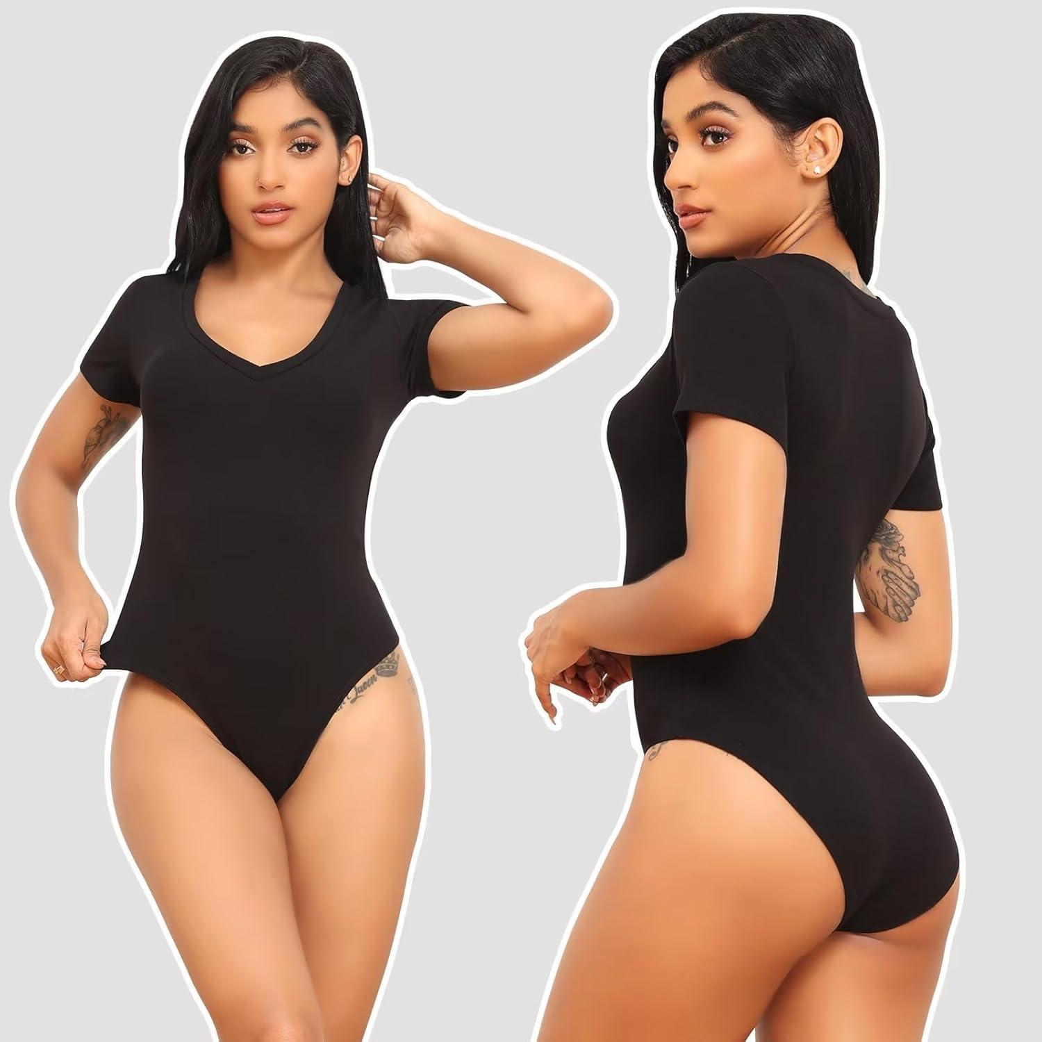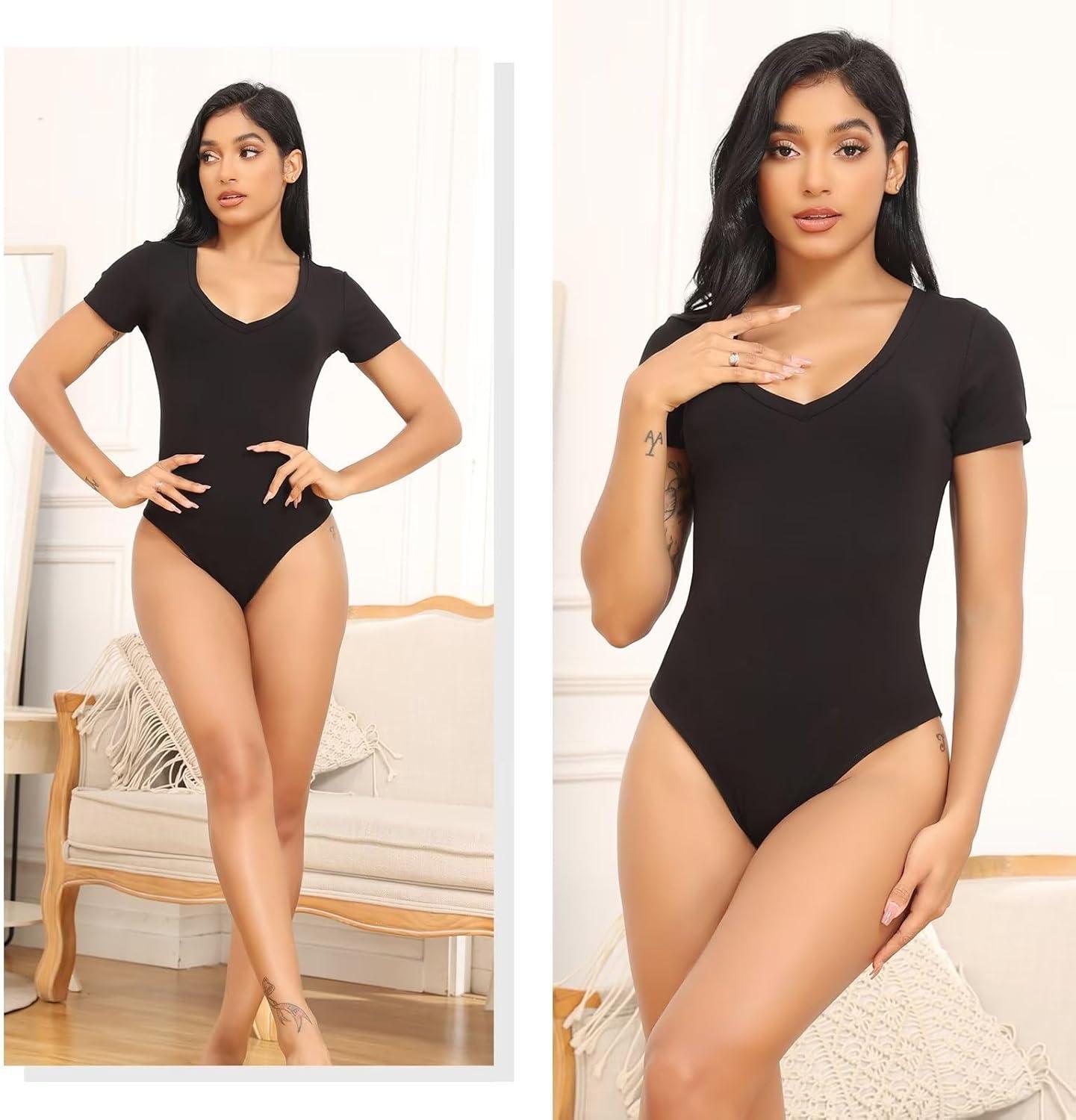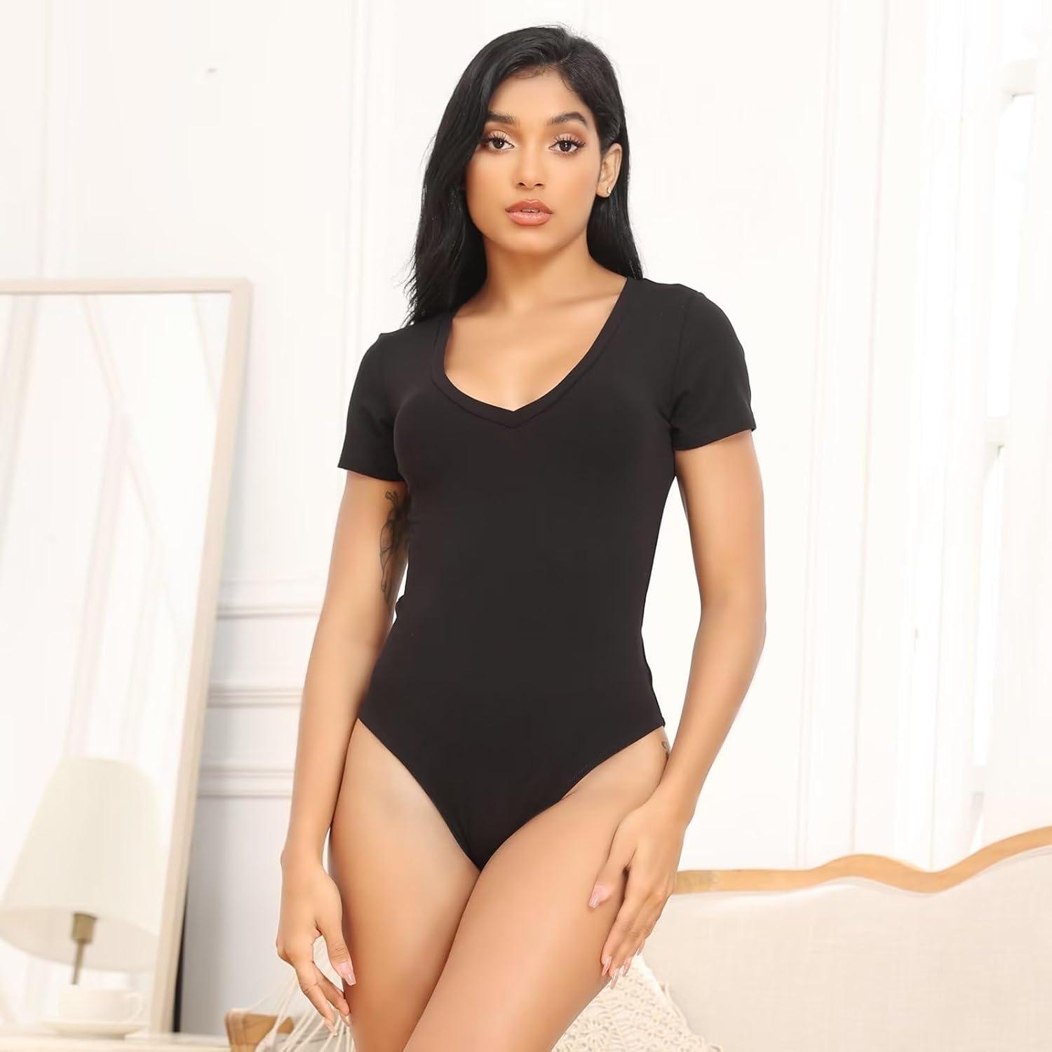 CE’ CERDR 5 Pack Bodysuits for Women Short Sleeve Deep V Neck Tops T-shirt Bodysuit Casual Outfits(5 Pack Black Light Grey Coffee Olive Green Dark Blue)