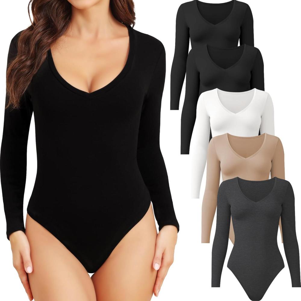 CE’ CERDR 5 Pack Long Sleeve Bodysuits for Women Deep V Neck Stretchy Basic Body Suit Tops(5 Pack Black Black White Nude Dark Grey)
